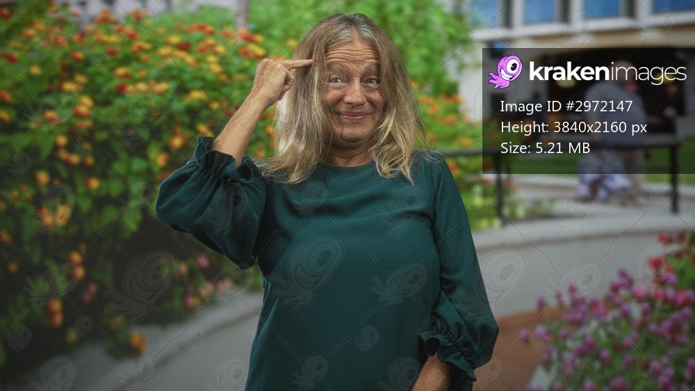 Senior woman in green blouse points finger to temple and smiles near a building entrance with garden and walkway; amused curiosity.