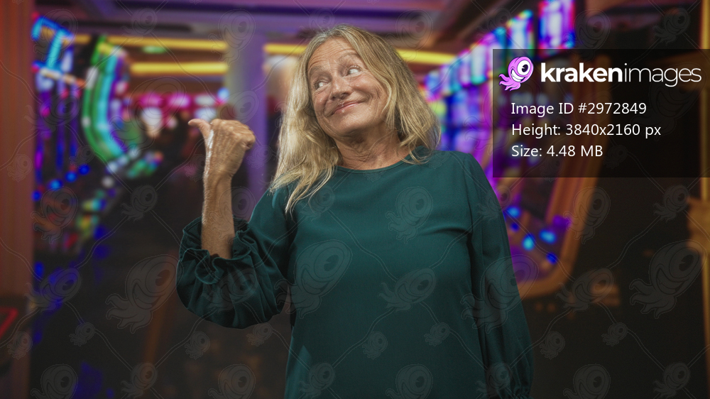 Senior woman in green dress pointing thumb toward slot machine in casino building, smiling with visible hand and candid expression; contentment luck.