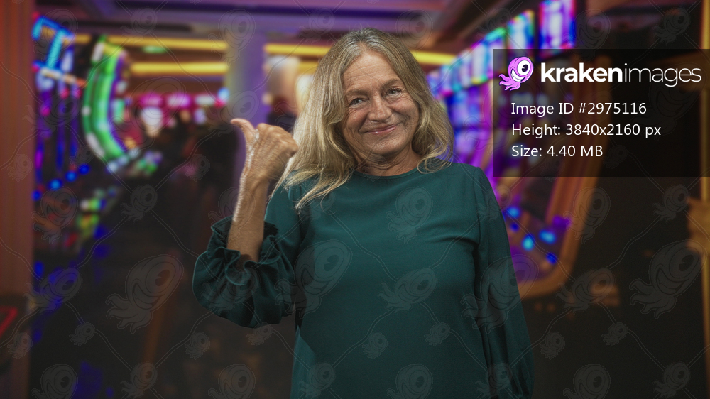 Senior woman in green dress pointing thumb toward slot machine in casino building, smiling with visible hand and candid expression; contentment luck.