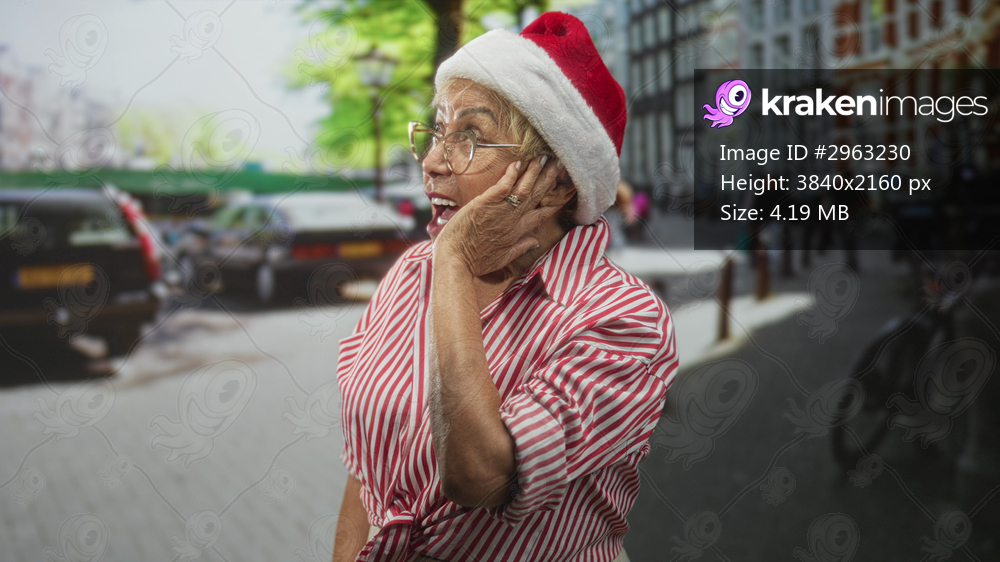 Senior woman in red santa hat and glasses touches cheek with hand and smiles, wearing knotted red striped shirt on a street with parked cars and bicycle; holiday joy nostalgia. - Kraken Images