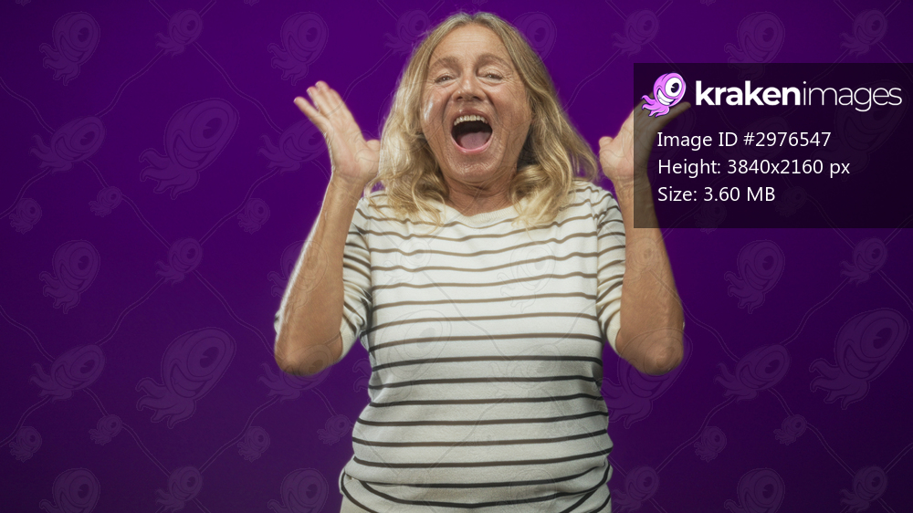 Senior woman in striped shirt raises fists and opens mouth cheering in studio with purple backdrop; joy celebration triumph.