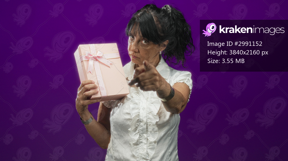 Senior woman in white blouse holds pink gift box and points finger to temple in studio with purple backdrop; skepticism contemplation.