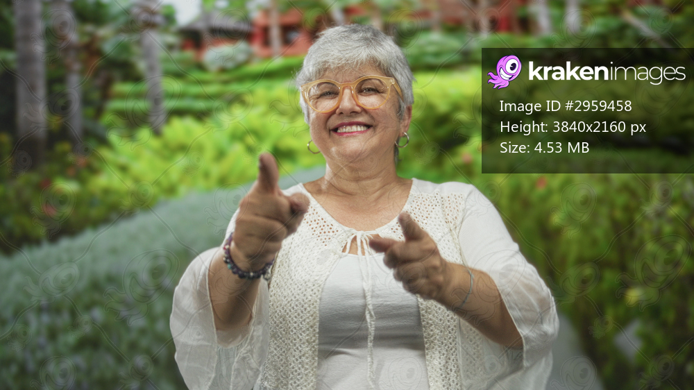 Senior woman in white blouse points both hands at camera with finger guns on a forest path lined with tropical plants; playful confidence.