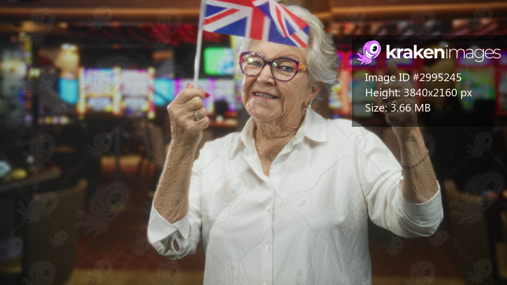 Senior woman in white shirt wearing glasses waves union jack flag with right hand and gives thumbs up with left hand in casino building among slot machines; patriotic pride. - Kraken Images