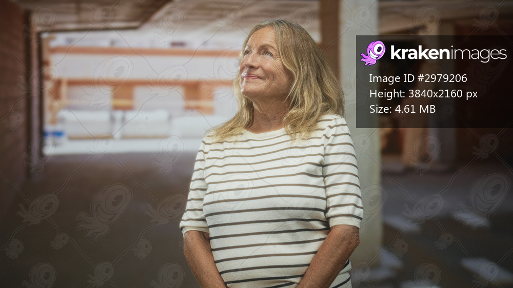 Senior woman in white striped shirt smiling and looking up amid concrete pillars and stairwell inside a building; quiet contentment.