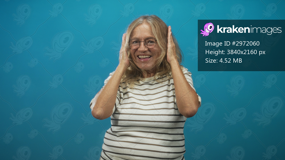 Senior woman laughing with hands framing face, wearing striped shirt and glasses, posing playfully against blue studio backdrop; joy playful energy.
