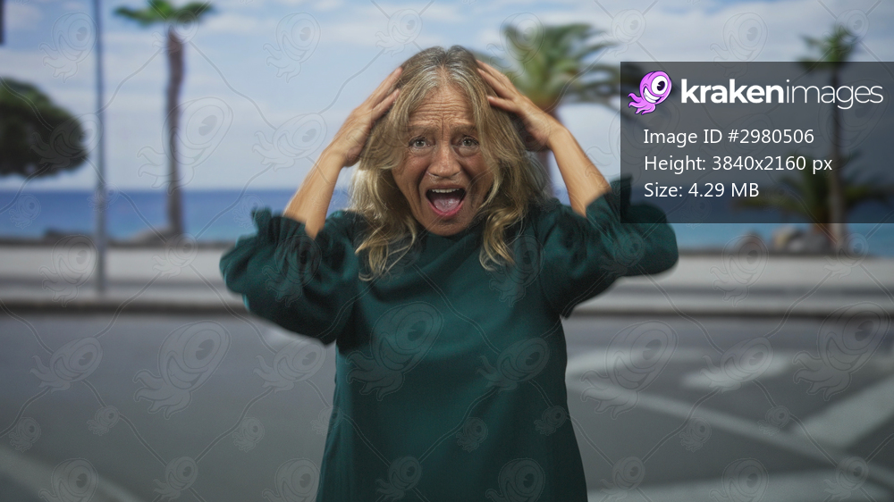 Senior woman laughing with hands raised and open mouth, hair tousled, wearing green dress in front of ocean palm trees on a street; joy.