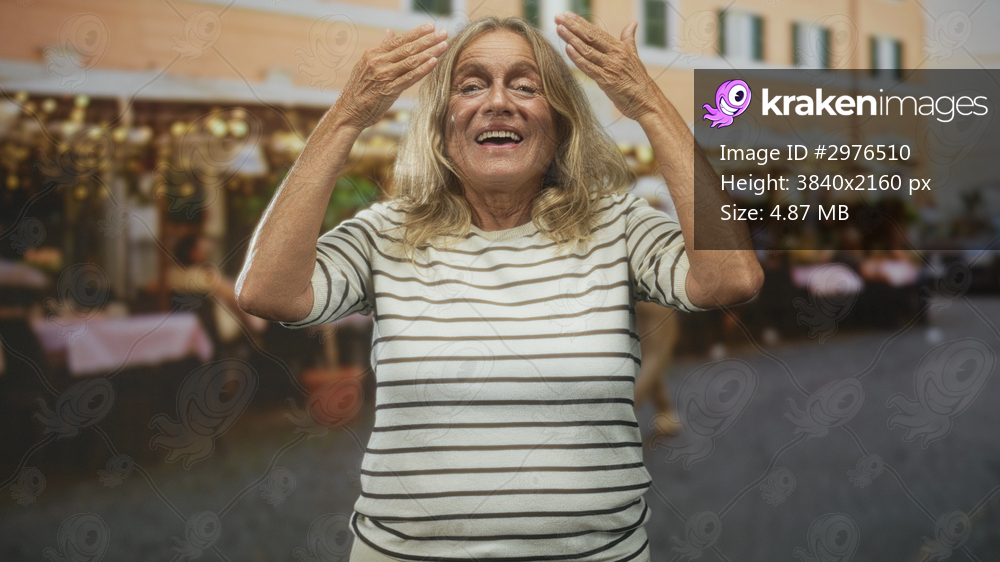 Senior woman laughing with hands raised showing bare forearms at a street cafe dining area, casual striped top; joy.