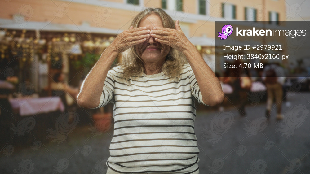 Senior woman laughing with hands raised showing bare forearms at a street cafe dining area, casual striped top; joy.