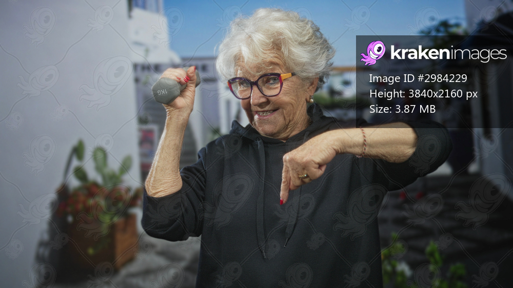 Senior woman lifting 1kg dumbbell and pointing finger down in sunlit street; active aging confidence.