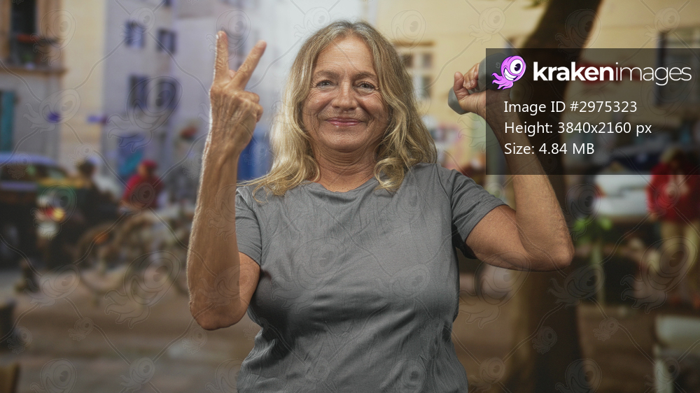 Senior woman lifting a dumbbell with her right arm while showing two fingers with her left hand, smiling in a city street scene with tree and bicycles; confidence vitality. - Kraken Images