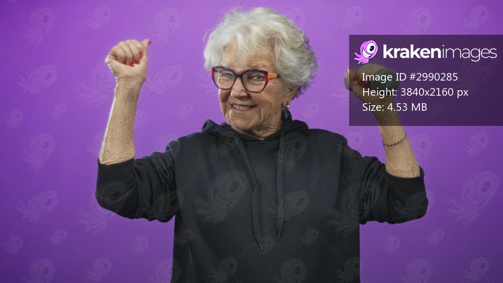 Senior woman lifting a dumbbell with raised arms and smiling against a purple studio backdrop; joy vitality.