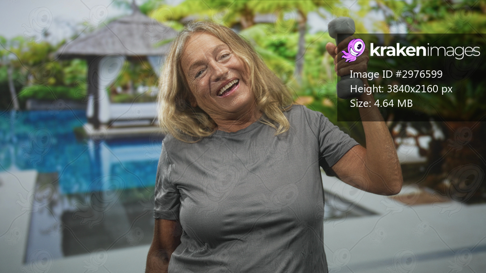 Senior woman lifts dumbbell overhead by a resort pool pavilion, smiling with eyes closed and raised right hand; joy strength.