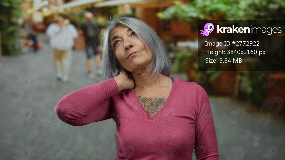 Senior woman with neck pain wearing a pink sweater stands outdoors on a cobblestone street with blurred people in the background, expressing discomfort while touching her neck. - Kraken Images