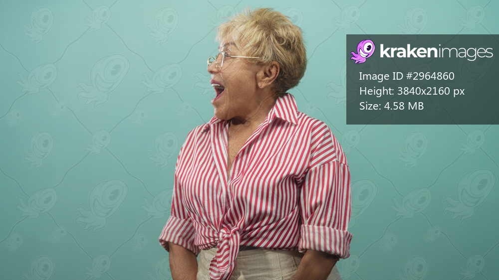 Senior woman with open mouth and turned head, wearing glasses and pink striped shirt against a teal studio backdrop; surprise playfulness warmth.