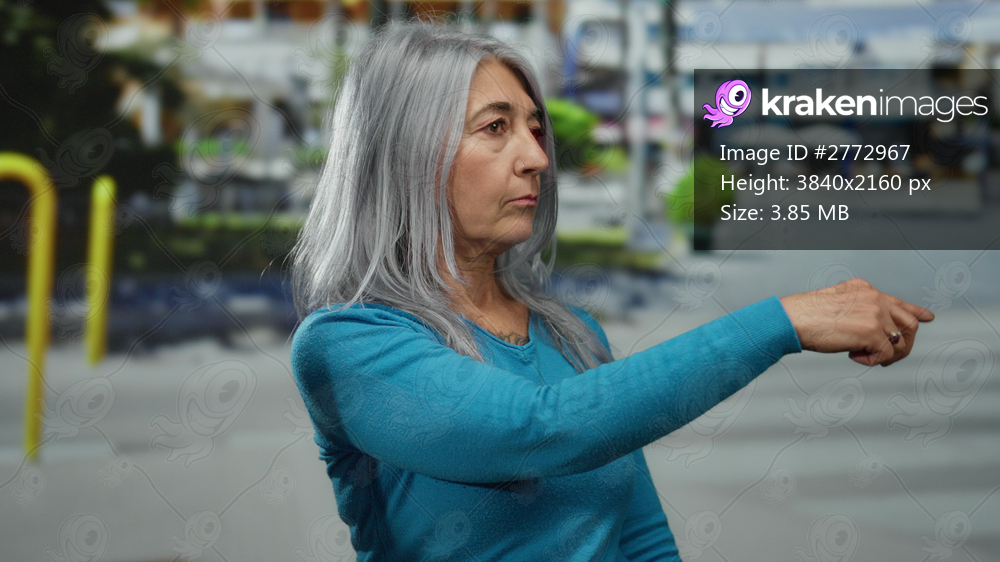 Senior woman outdoors making go away gesture on a street, wearing blue sweater with determined expression, surrounded by urban landscape featuring buildings and greenery. - Kraken Images