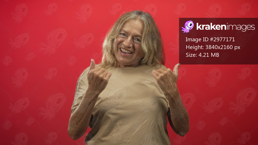 Senior woman with outstretched hands smiling and laughing, giving thumbs up in a studio with red backdrop; joyful warmth.