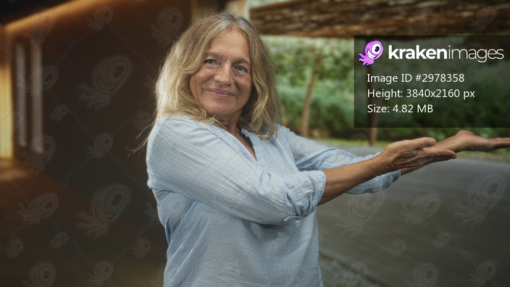 Senior woman with outstretched palms gesturing and smiling while presenting beside a wooden pergola building with greenery; contentment nature appreciation. - Kraken Images