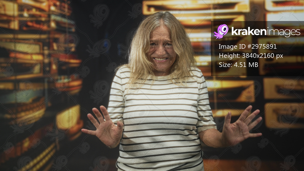 Senior woman with palms raised and pained grimace in a building gallery of boat models, striped shirt visible; distress reflection.