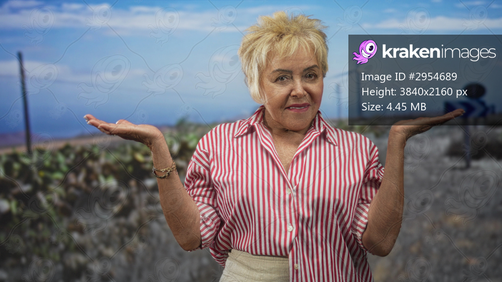 Senior woman with palms up shrug beside wind turbine and roadside sign on street, wearing striped shirt and bracelet; curiosity choice.