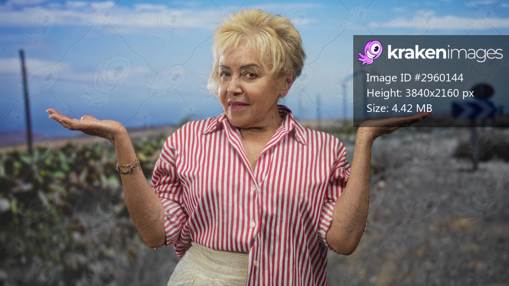 Senior woman with palms up shrug beside wind turbine and roadside sign on street, wearing striped shirt and bracelet; curiosity choice.