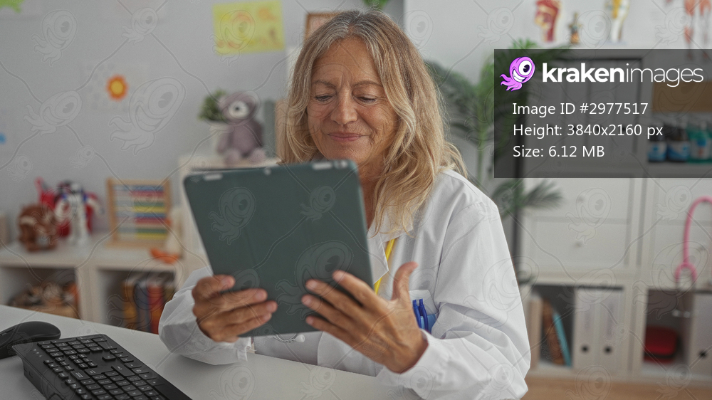 Senior woman pediatrician holds tablet, hand under chin while seated at desk with keyboard, reviewing notes in clinic building; calm thoughtful care.