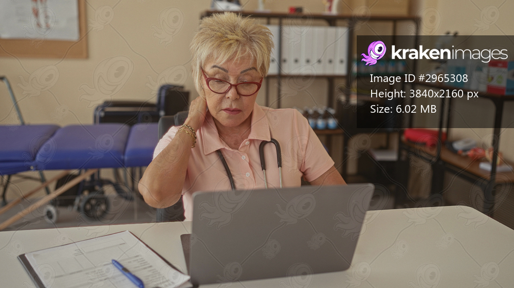 Senior woman physiotherapist holding neck while seated at laptop with stethoscope and treatment table in clinic; professional concern.