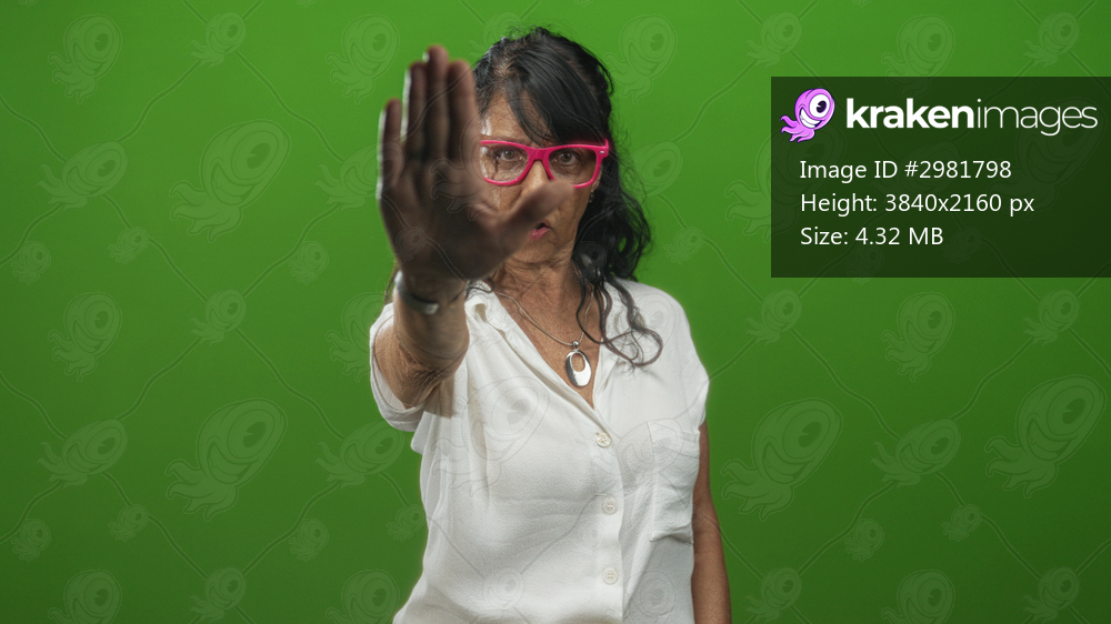 Senior woman with pink glasses raises hand palm forward stop gesture in studio wearing white blouse and pendant necklace; personal defiance.