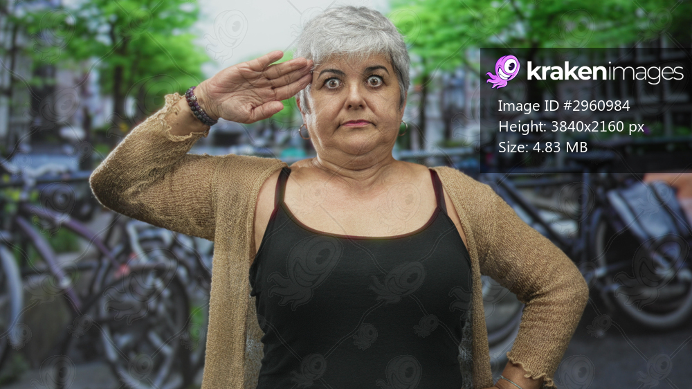 Senior woman plus size with grey hair salutes with hand to forehead beside parked bicycles on a street canal lined with trees; confidence resilience.