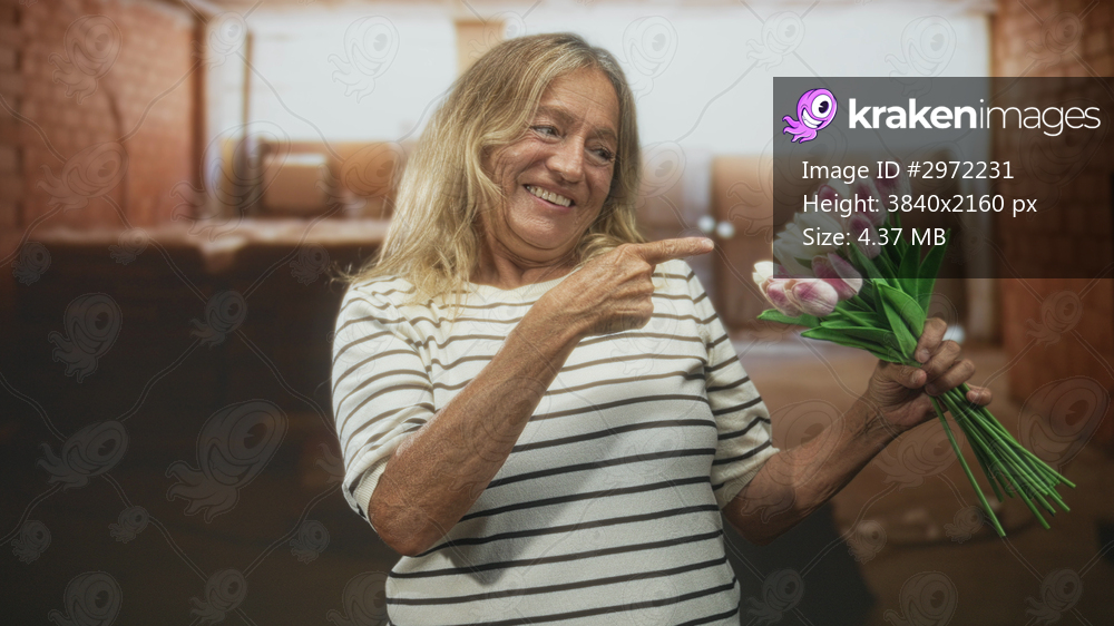 Senior woman pointing finger at pink tulip bouquet while holding flowers and smiling inside a brick building; gratitude.