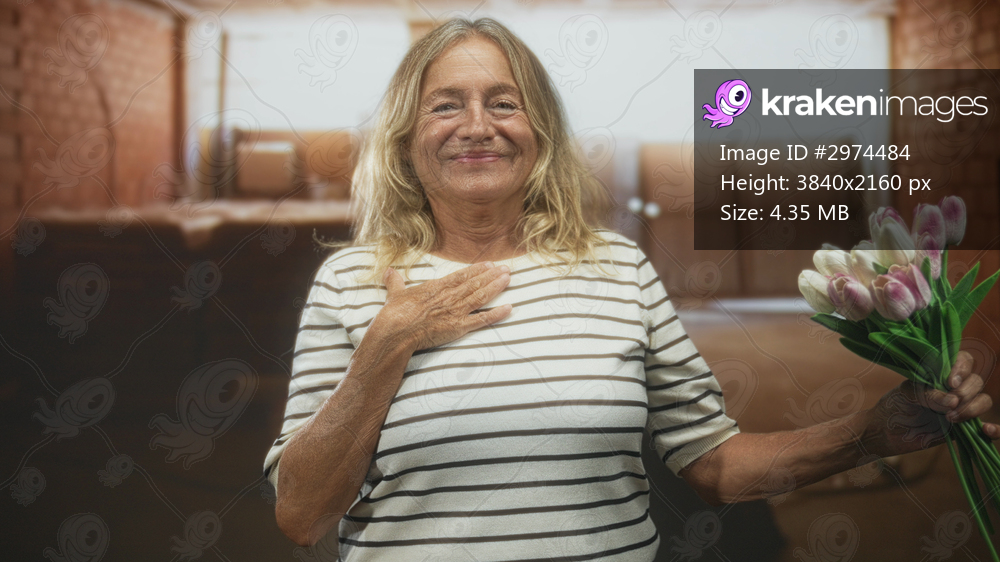 Senior woman pointing finger at pink tulip bouquet while holding flowers and smiling inside a brick building; gratitude.