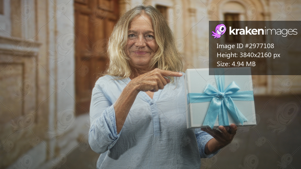 Senior woman pointing finger at wrapped gift box with blue ribbon in studio; sharing celebration moment.