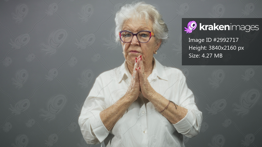 Senior woman pointing finger to the right with raised hand, wearing glasses and white blouse in studio; confidence greeting.