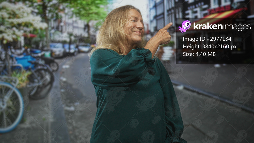 Senior woman pointing finger upward on street with bicycles and sidewalk cafe; joy confidence contentment.