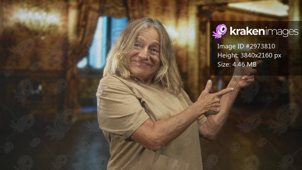 Senior woman pointing fingers with bare hands, smiling in an ornate ballroom building; contentment acceptance.