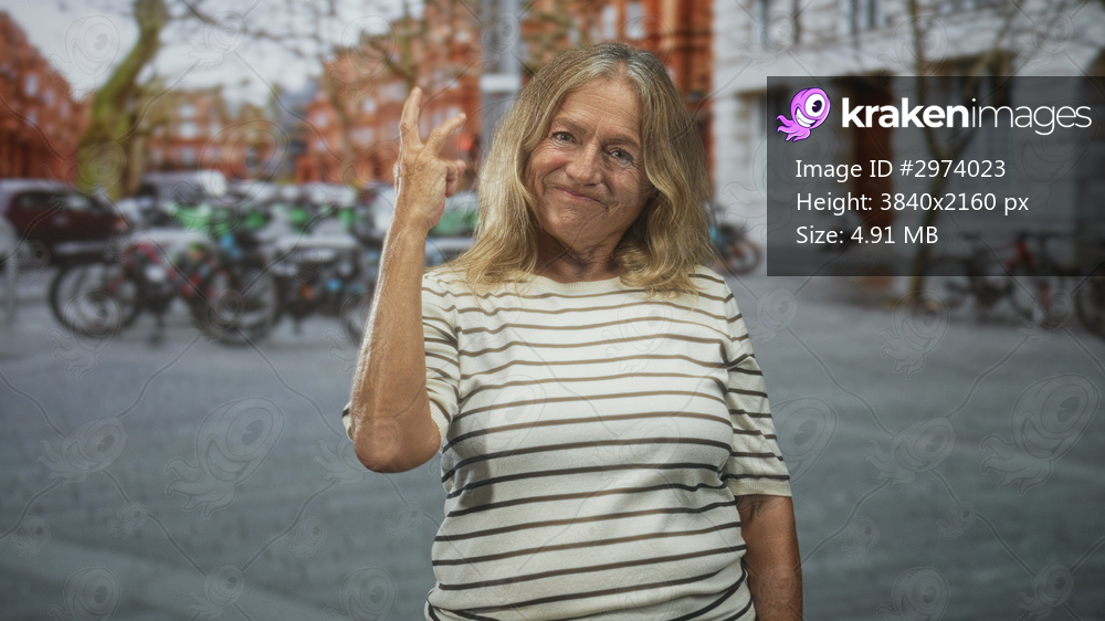Senior woman pointing index finger up with visible hand and forearm, smiling, wearing striped shirt on cobblestone street near parked bicycles and red brick buildings; contentment optimism. - Kraken Images