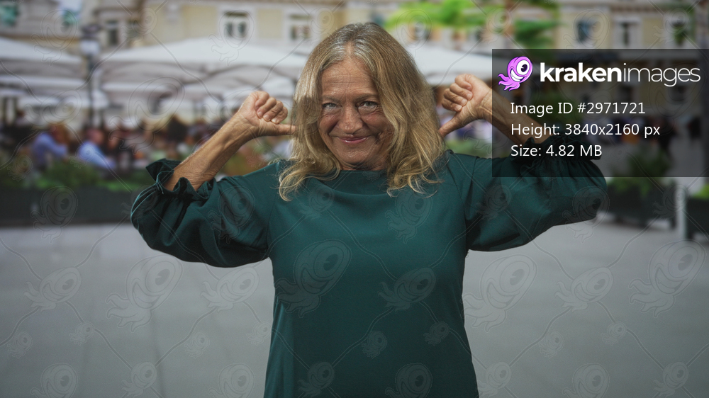 Senior woman pointing thumbs to chest on street plaza wearing green dress, smiling with eyes closed and raised hands; pride self assertion.