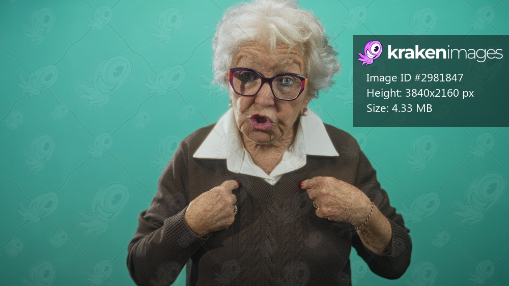 Senior woman points at her chest and adjusts sweater collar while speaking directly to camera in studio; defiance self assertion.