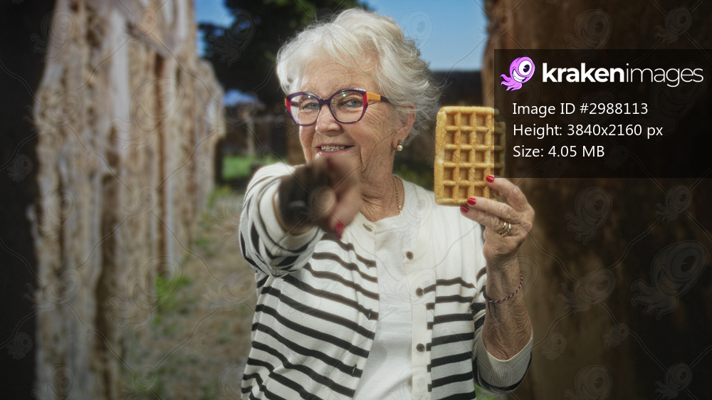 Senior woman points finger at camera while holding a waffle and wearing red nail polish by a building column; playful delight.