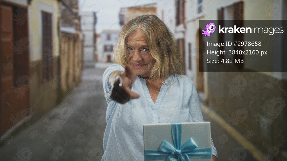 Senior woman points finger at camera while holding a wrapped gift box on a narrow street; celebration joy.