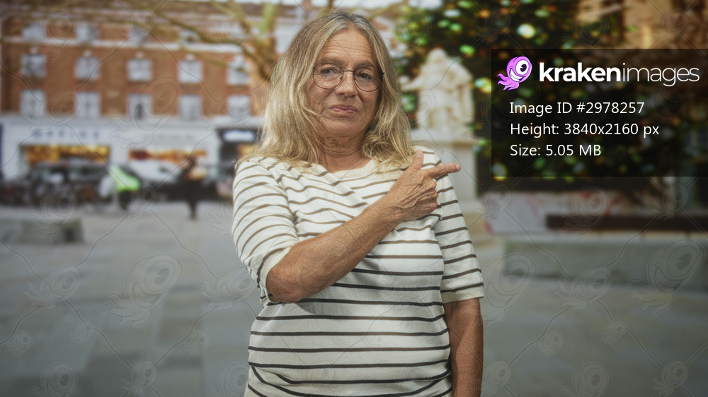 Senior woman points finger at decorated christmas tree on street, visible hand gesture, wearing striped shirt and glasses, outdoor plaza scene; skepticism. - Kraken Images