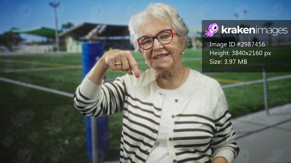 Senior woman points finger down at ring on hand by sports field building, wearing glasses and striped cardigan; nostalgia memory.