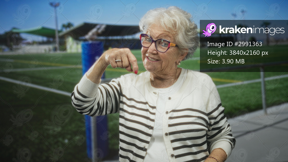 Senior woman points finger down at ring on hand by sports field building, wearing glasses and striped cardigan; nostalgia memory.