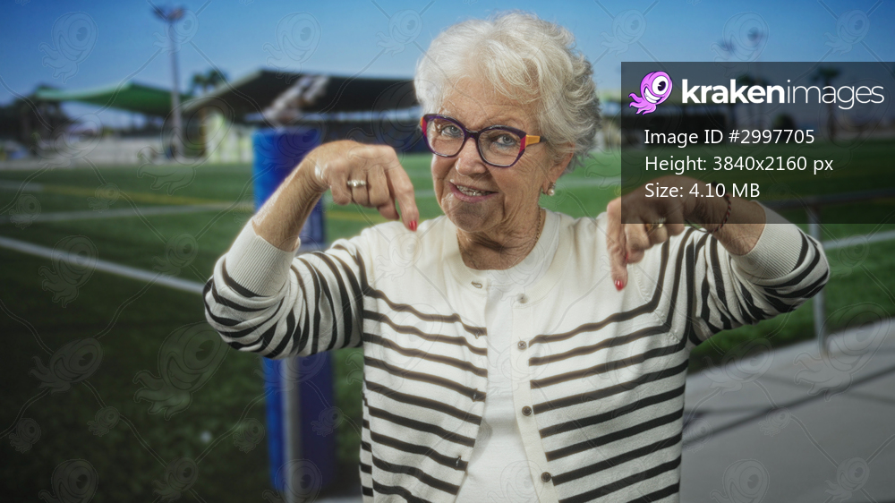 Senior woman points finger down at ring on hand by sports field building, wearing glasses and striped cardigan; nostalgia memory.
