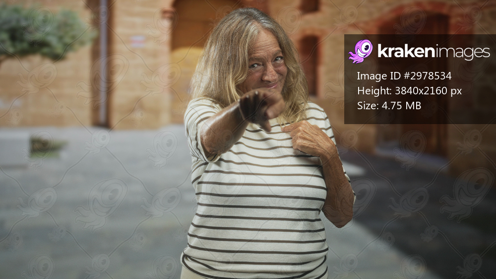 Senior woman points finger and holds her shirt with the other hand on a sunlit stone street, smiling at camera; playful confidence.