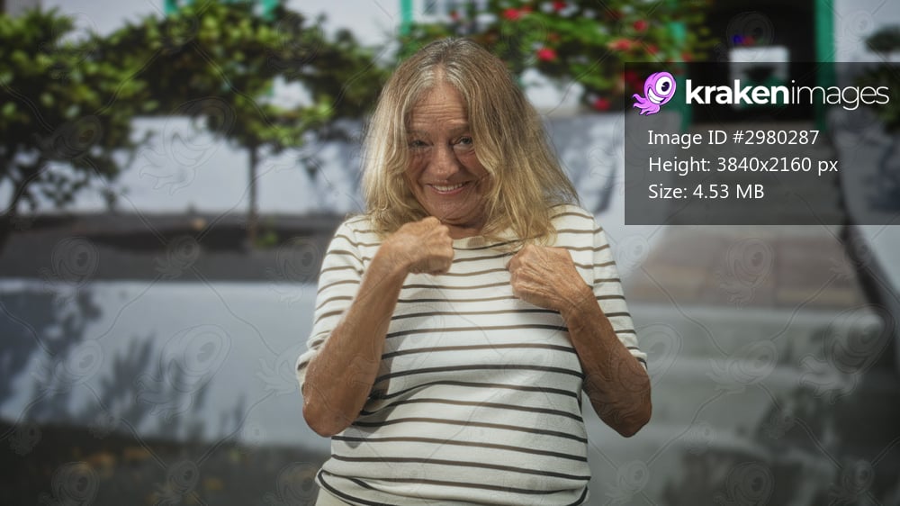 Senior woman points finger to camera while clutching her chest in front of a building with steps and flowers visible; playful confidence.