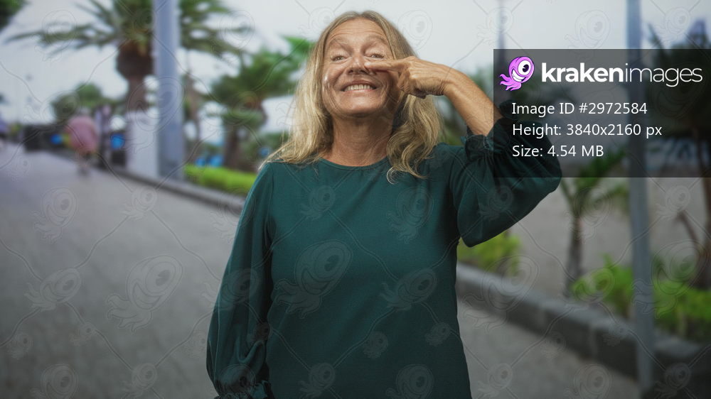Senior woman points finger to cheek while smiling on a seaside street promenade lined with palm trees and lampposts; joy playfulness.