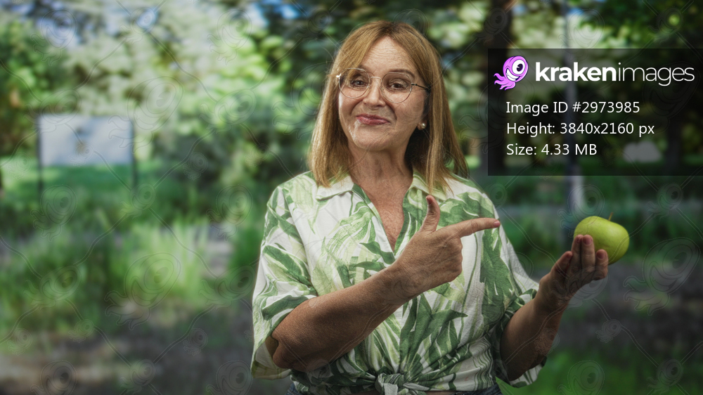 Senior woman points finger to green apple and holds it in one hand in a sunlit forest setting, smiling; healthy living wellness.