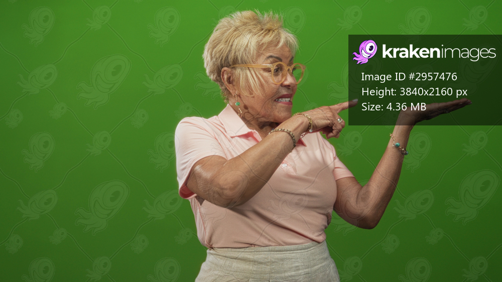 Senior woman points finger to open palm in studio wearing glasses and bracelet, smiling and presenting an offer; playful joy.