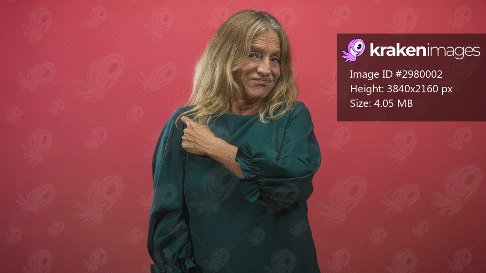 Senior woman points finger to side and touches shoulder in studio with pink backdrop; skepticism reflection.